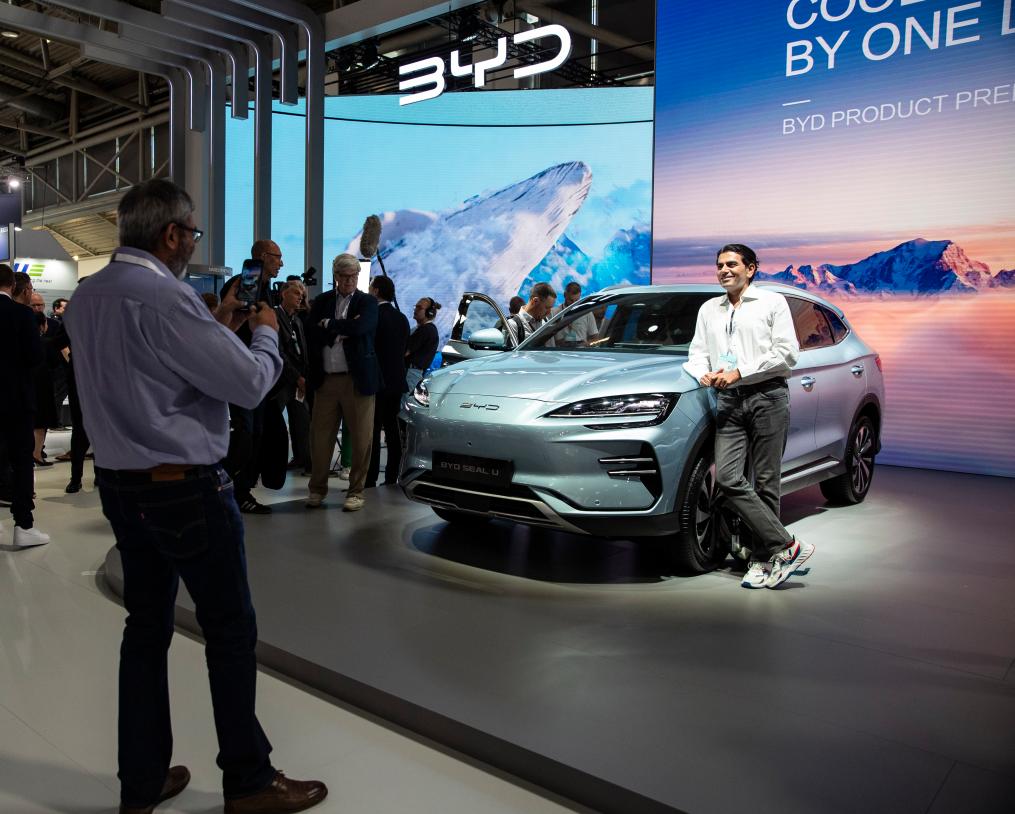 9月4日,在德國慕尼黑國際車展媒體預(yù)展上,參觀者在比亞迪品牌發(fā)布會現(xiàn)場與BYD SEAL U汽車合影。新華社記者 張帆 攝